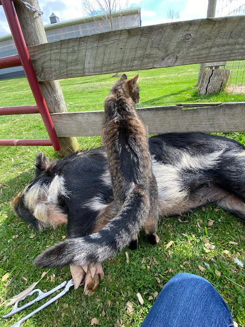 Yesterday was mowing day (again). When we were finished, I spent a little time in the front pasture with the pigs. They are both in need of hoof trimmings. Luckily, MaryAnn makes this task quite easy. She automatically lies down so that I can rub her belly - making nail trimming a piece of cake.