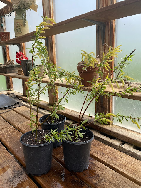 Because willows are so hearty and fast and easy to grow, I took some cuttings and stuck them in potting soil to root. How do I know this will work? How do I know I will have four new trees to plant by the end of summer? Well, years ago I made a wattle fence in the garden out of what I though were dead willow branches. The branches in that fence put down the most hardy roots and turned into trees within a year. And none of those branches were buried in the soil - they were simply woven between upright bamboo posts. So, with these cuttings in moist potting soil, we'll have a few new trees in no time!